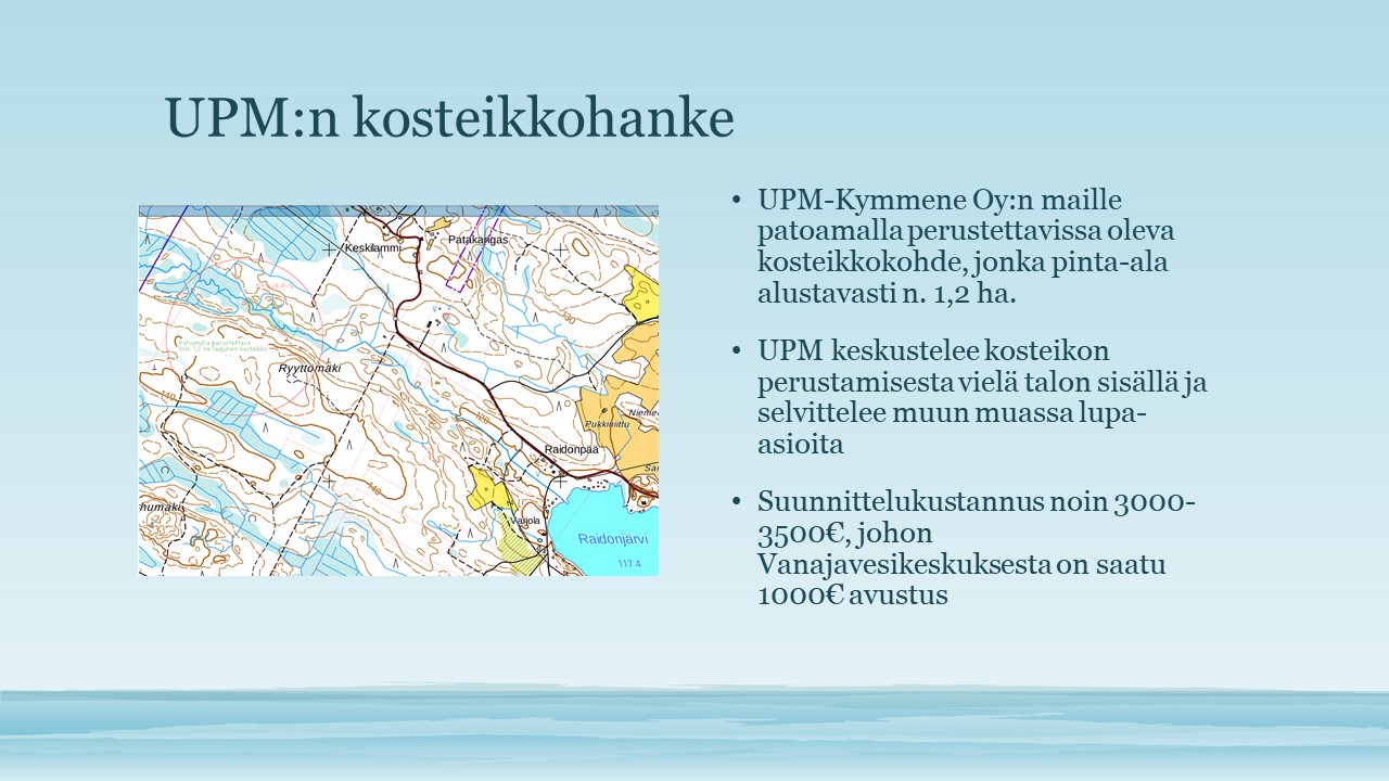 - Vuonna 2020 UPM Metsä innostui hankkeesta ja teimme 12.8.2020 maastokatselmuksen Raidonjärveen laskevan ojan varrella, UPM-Kymmene Oyj:n omistalla kiinteistöllä. Tässä linkki katselmukseen.