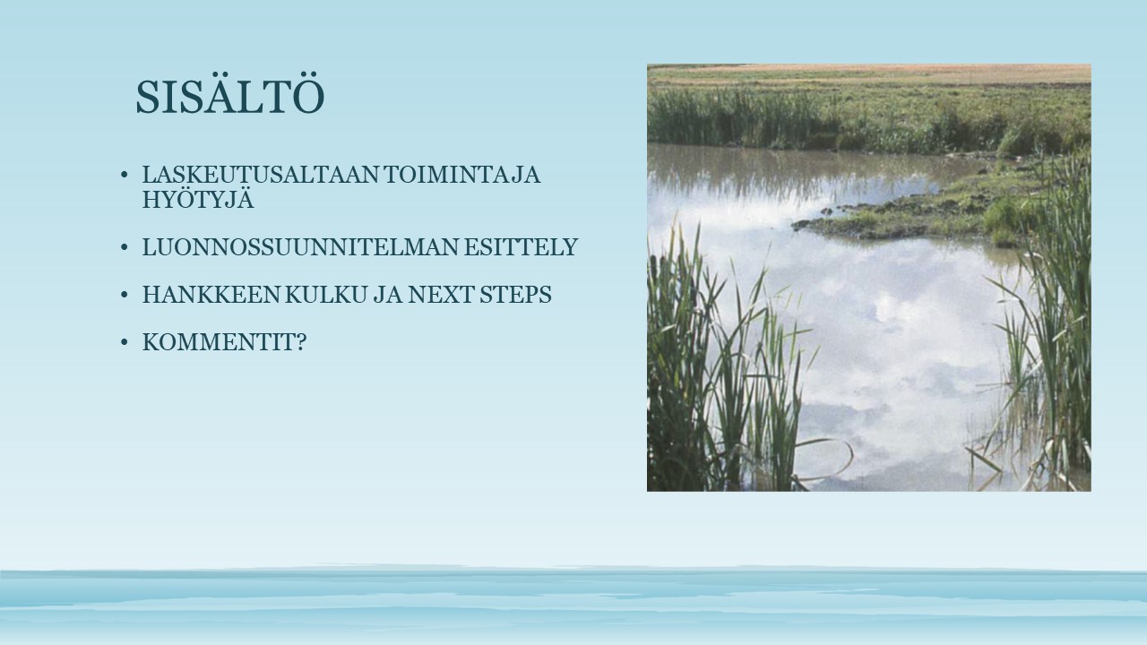 - Tässä hankkeessa olisi tarkoitus ensin rakentaa pelloilta laskevaan ojaan laskeutusallas vähentämään sieltä tulevaa kuormitusta.